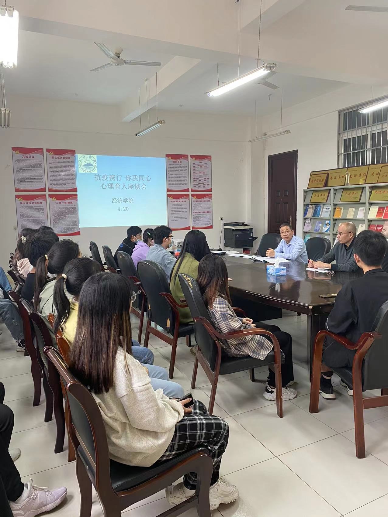 4月20日下午taptap点点官网在义丰楼619开展“抗疫携行 你我同心”心理育人座谈会。学院党委书记漆晗东、副书记谢忠、心理工作负责人丁春、各班心理委员参会。