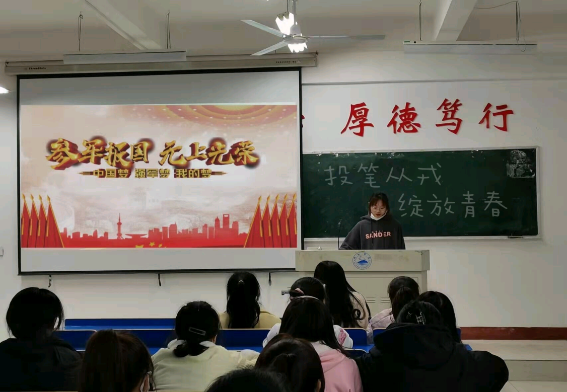 会上,各班负责人向全班同学们传达了国家征兵的相关政策内容,阐述了当兵的益处和重要性,并播放了军旅生活相关的纪录片,随后,介绍了入伍后的日常训练项目和时间安排,呼吁同学们积极报名参加,为中国军事发展贡献一份力量。