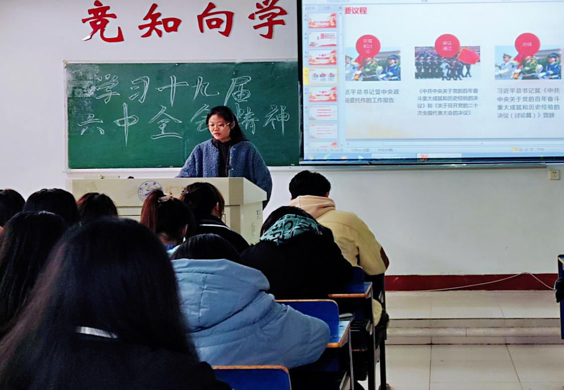 活动伊始,主讲人讲述了党的十九届六中全会的基本概况,强调了在生活、学习中贯彻党的十九届六中全会精神的重要性。接着,结合历史经验,分析了中国在政治、经济、文化等方面的发展历程。最后呼吁同学们要以史为鉴,坚持走中国特色社会主义道路,树立好共产主义远大理想,实现自身发展。