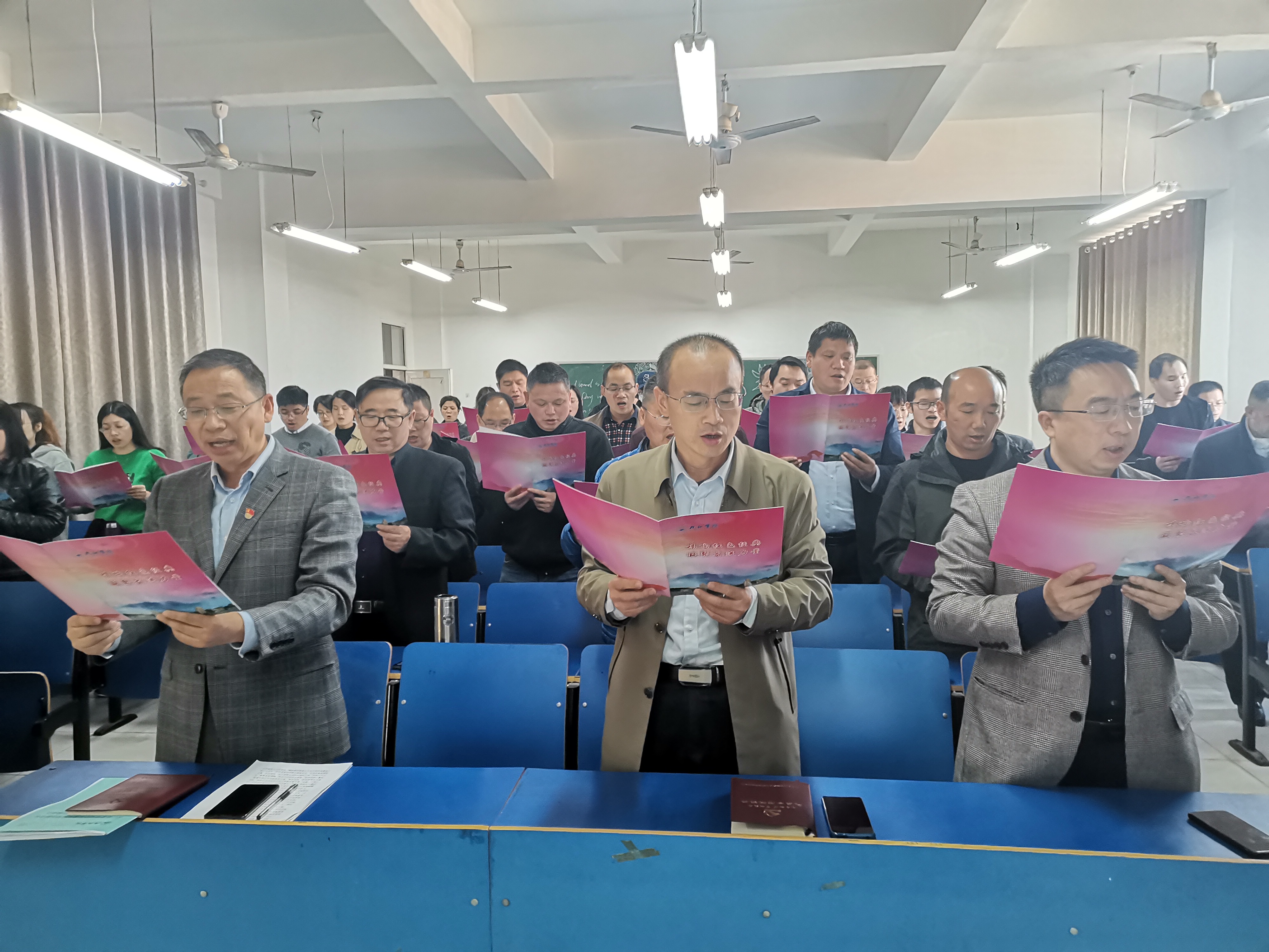 会议前,学院全体领导班子成员和全体教师齐唱红色歌曲《我们走在大路上》。会上,漆晗东书记领学了《建设具有强大凝聚力和引领力的社会主义意识形态》等文件。