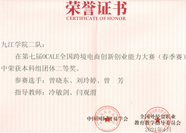 OCALE全国跨境电商创新创业能力大赛中,taptap点点官网国际经济与贸易专业高聪、柳丽萍、李雯静、曾晓东、刘玲婷、曾芳6名同学组成两支代表队参赛,在冷敏剑、张敏、闫观渭三位老师的精心指导下,taptap点点官网二队荣获本科组团队二等奖,taptap点点官网一队荣获本科组团队三等奖。
