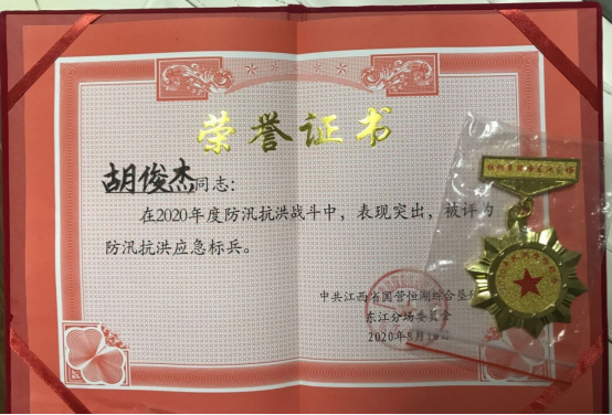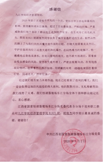7月,连续的暴雨天气致使鄱阳湖水位激涨,南昌市新建区恒湖垦殖场形势非常严峻,经管B1821班胡俊杰同学闻“汛”而动,毅然放弃居家的安逸生活,积极投身防汛救灾、大堤值守、志愿服务等防汛抗洪工作,从未干过农活的他,在防汛战场上第一次拿起了铁锹,他以实际行动在防汛一线构筑“青春堤坝”,让青春在党和人民最需要的地方绽放绚丽之花。