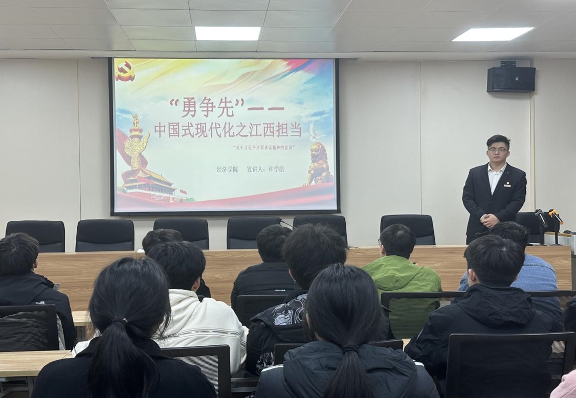 许学航、顾喜、路婧怡等宣讲员以习近平总书记考察江西重要讲话精神为重点,结合自身经历,以大学生的角度告诉在座学生学习习近平生态文明思想的必要性和重大意义,更好地贯彻党的二十大精神,推进绿色发展,实现中国的绿色崛起。