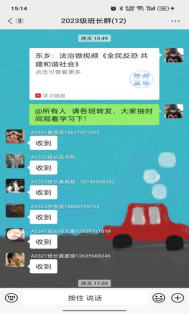 将学习强国APP以及其他官方账号内的反恐相关知识信息,通过转发班级微信、qq群,以学生更能接受,方便、直接的形式组织开展个人学习,更进一步让同学们知恐、防恐,提升他们知法、懂法、守法意识和能力,不断增强同学们的中华民族共同体意识。