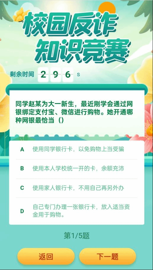组织学生参与九江农行开展的“农行杯”校园反诈知识竞赛,同学们参与程度较高,活动中对正确回答5道防诈小问题的同学提高了小奖品。通过丰富多彩的形式引导大家参与活动,提高投身反诈知识学习掌握的积极性。