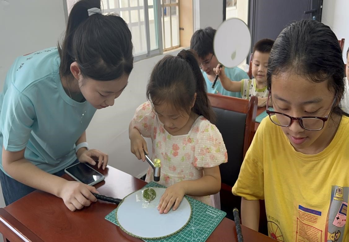 最后,带着满满的收获与热情,7月2日下午,小分队走进泽泉乡朝阳社区,将这份独特的文化体验传授给了当地的留守儿童。通过互动教学与亲手操作,孩子们不仅学会了捶草印花的基本技巧,更在心中种下了传承与发扬传统文化的种子。