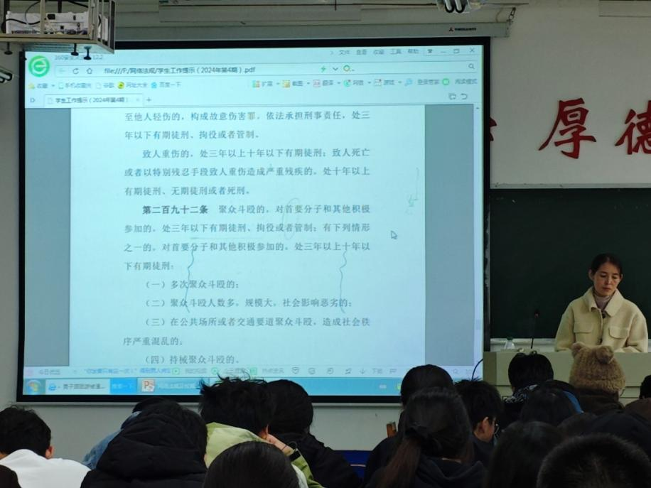 班会开始,老师通过一个个真实生动且贴近学生生活的法律案例直观地呈现了违法犯罪行为的严重后果,让同学们真切感受到法律的威严与不可侵犯。