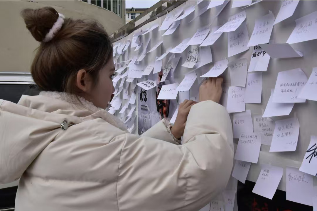 活动现场,志愿者们积极引导,人们在横幅上庄重签名,笔划间都是对历史的深情追忆和对祖国未来的美好祈愿。现场氛围凝重,墙板上的纸花寄托着无尽的哀思。志愿者们还摆放了蜡烛灯悼念逝去的同胞。活动结束后,志愿者们仍保持庄严肃立的姿态,用无声的行动诠释着对历史的敬畏与和平的珍视与守护。