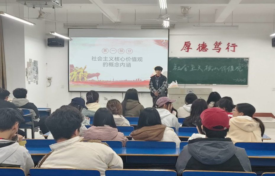 班会开始时,主讲人详细解析了“富强、民主、文明”等24字方针的深层含义,使学生们能够更深刻地理解社会主义核心价值观的本质。接着,通过引入经济领域的具体实例,主讲人将诚信经营与敬业奉献等体现社会主义核心价值观的行为生动形象地展示给同学们,把复杂的理论知识转化为易于理解的实际内容。台下的学生们表现出浓厚的兴趣,并积极分享了他们所了解的相关案例。