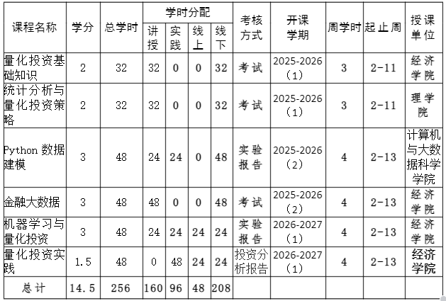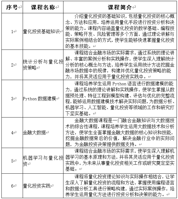 本专业涵盖了金融市场基本理论、数据分析与建模、金融产品定价、投资组合优化、风险管理和金融工程等多个领域,课程包括:量化投资基础知识、统计分析与量化投资策略、Python数据建模、金融大数据、机器学习与量化投资、量化投资实践共6门课程。课程注重理论与实践的结合,学生需修完13个学分。