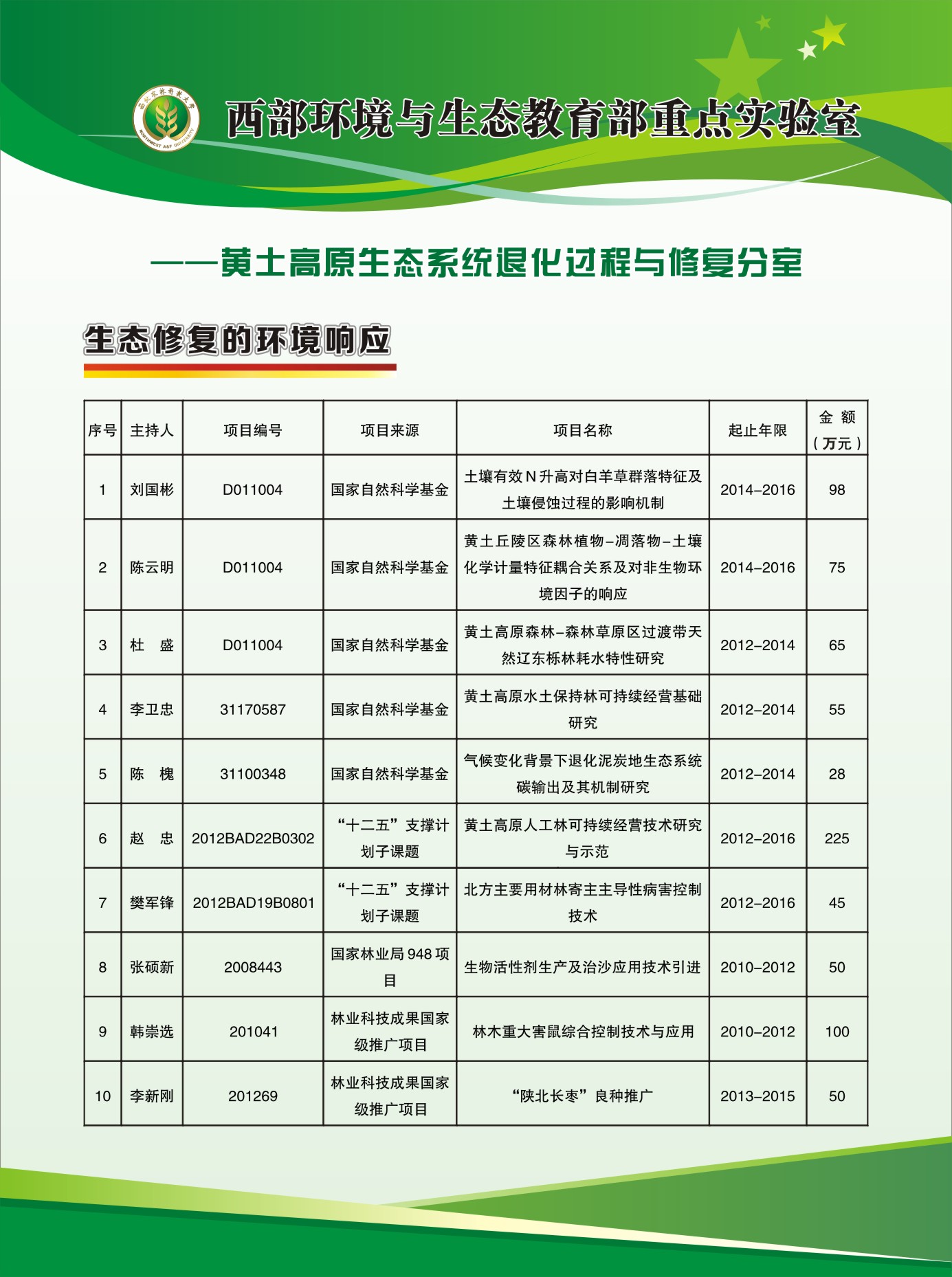 ① 退化生态过程及环境演变:环境要素动态监测及指标提取,以人为破坏植被,土地不合理用造成黄土高原水土流失为主的生态退化过程及侵蚀环境演变机制,生态系统退化过程的模拟与预警。